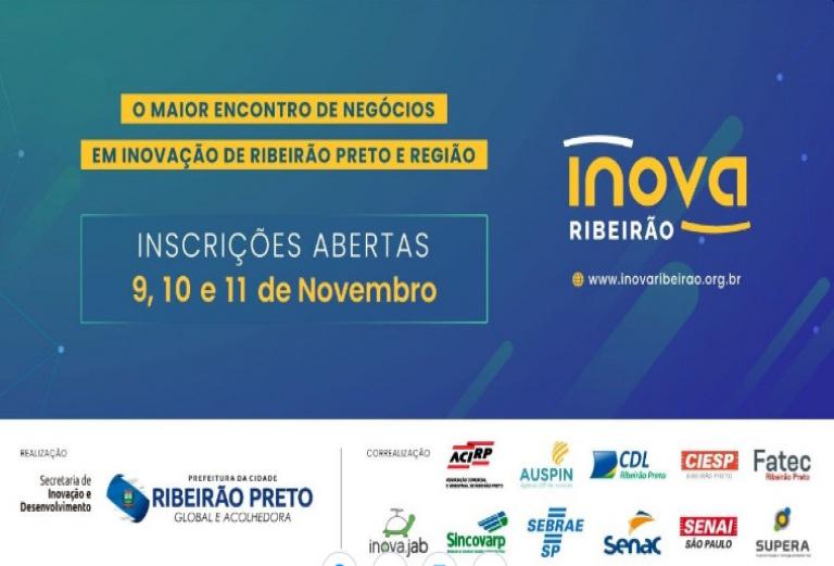 A Prefeitura de Ribeirão Preto, por meio da Secretaria de Inovação e Desenvolvimento, promoverá em novembro, nos dias 9, 10 e 11, o INOVARIBEIRÃO 2021, maior encontro de negócios em inovação de toda a região. São parceiros do município na realização do evento a Acirp, Auspin, CDL Ribeirão Preto, Ciesp, Fatec, InovaJab, Senac, Senai, Sebrae, Sincovarp e Supera.